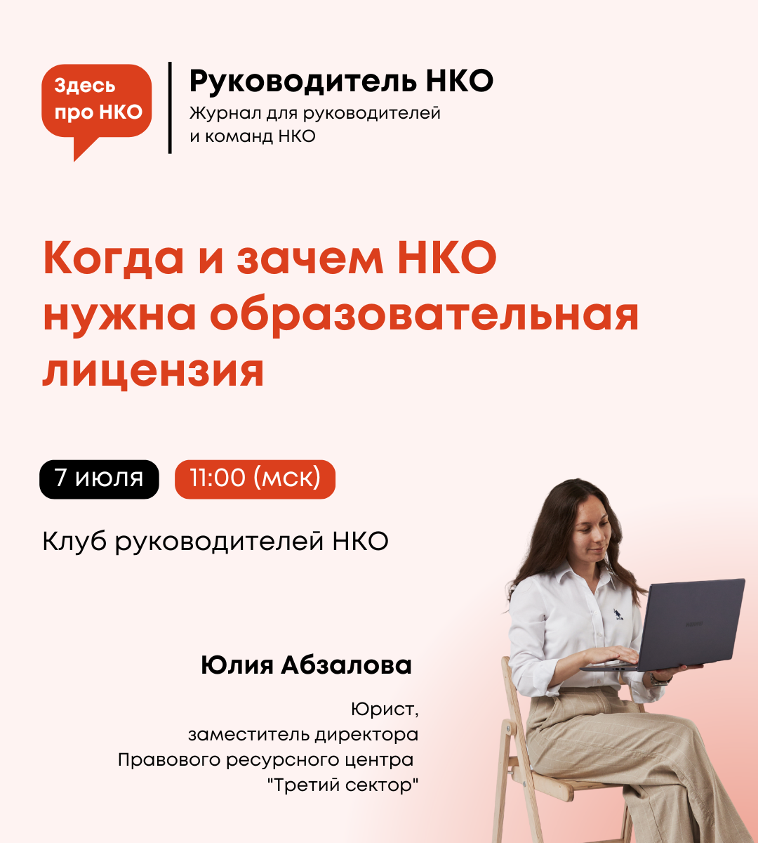 Тема онлайн-встречи - "Когда и зачем НКО нужна образовательная лицензия". На вебинаре с экспертом поговорим о том, в каких случаях некоммерческой организациям требуется лицензия на ведение образовательной деятельности, а также разберем вопросы:
